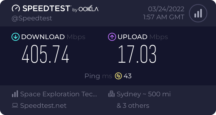 Please note that this speeds are referring to a Standard Generation Kit on a Residential $139 AUD Per Month Plan. A Starlink Mini is about 50% slow than the above speeds, however, still perfectly capable for on the go internet. The $99 Residential Lite Plan may experience slow speeds. You can view Starlink Residential Home vs Starlink Reseidential Lite speed comparisons here.Starlink Speed in my area
